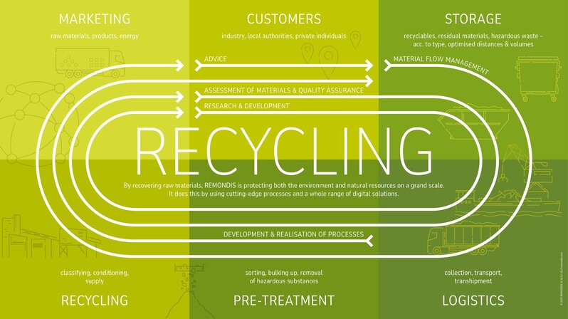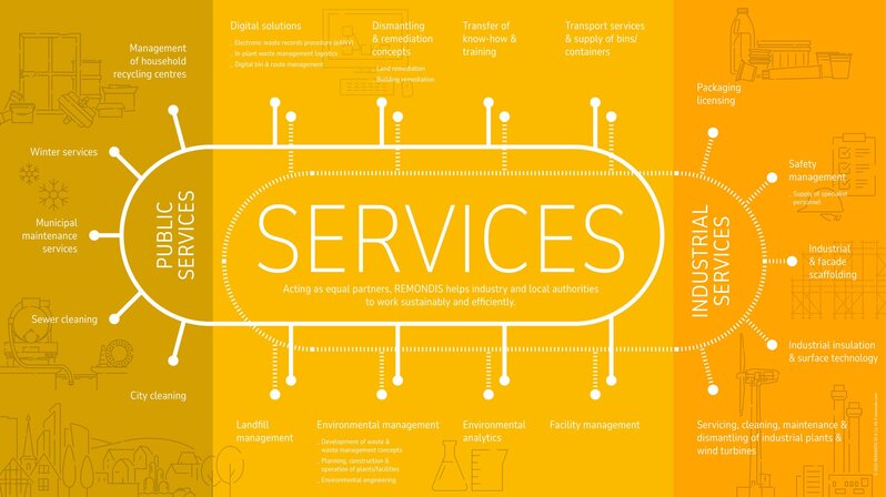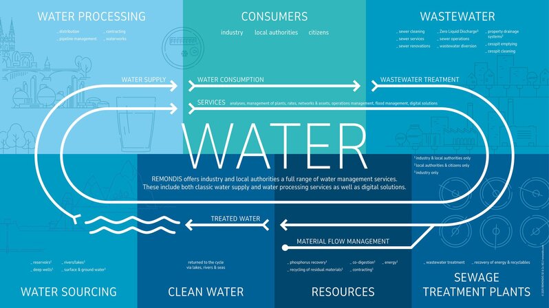 The majority of the operations at the Lippe Plant involve recycling. REMONDIS, however, has so much more to offer. Its portfolio includes a comprehensive range of services for industrial businesses, councils and local residents as well as all aspects of water management. Would you like to learn more? Then simply click on the following infographics to find out more about our three fields of business. They provide detailed information about what we offer our customers and how we are working for the future.
